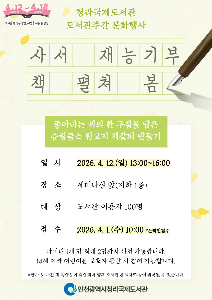 청라국제도서관 도서관주간 문화행사 사서 재능기부「책 펼쳐 봄」